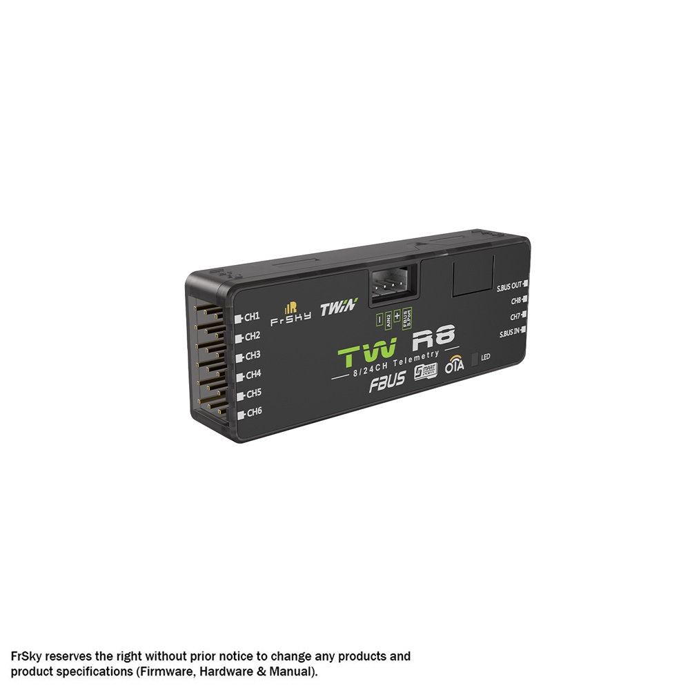 Der TW R8 Empfänger ist mit 2x 2.4GHz Antennen ausgestattet. Die Signalausgänge umfassen einen SBUS-Ausgangskanal und 8 PWM-Ausgangskanäle. Er unterstützt auch Telemetriefunktionen über FBUS / S.Port. Durch die Verwendung des FBUS-Protokolls im ETHOS-System können die Signalsteuerung und die Telemetrie mit jedem Gerät, das das FBUS-Protokoll unterstützt, über nur eine Kabelverbindung verbunden werden, um eine bidirektionale Übertragung zu erreichen, was auch den Aufbau des Modells mit weniger Kabeln vereinfacht. Darüber hinaus kann der invertierte S.Port des Empfängers den einfachen Anschluss von Flugreglern ermöglichen.